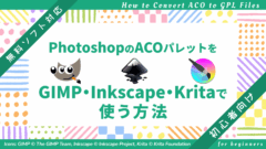 Lesson PhotoshopのACOパレットをGIMP・Inkscape・Kritaで使う方法【ツールで自動化・上級者向け】 前回はPhotoshop向けのカラーパレットのACOファイルを、画面の操作だけで簡単にフリーソフトで使えるGPLファイルにする方法をお伝えしました。GIMPでパレットのインポートからACOファイルを読み込むと自動的にGPLファイルとしてpa... 2025.09.22 Lesson