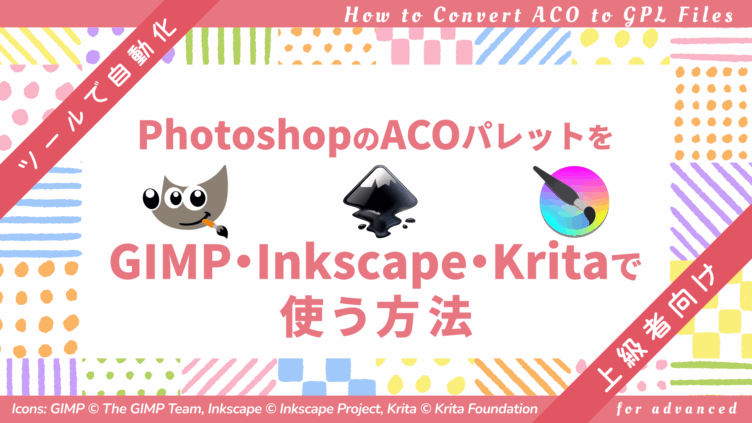 Lesson PhotoshopのACOパレットをGIMP・Inkscape・Kritaで使う方法【ツールで自動化・上級者向け】 前回はPhotoshop向けのカラーパレットのACOファイルを、画面の操作だけで簡単にフリーソフトで使えるGPLファイルにする方法をお伝えしました。GIMPでパレットのインポートからACOファイルを読み込むと自動的にGPLファイルとしてpa... 2025.09.22 Lesson