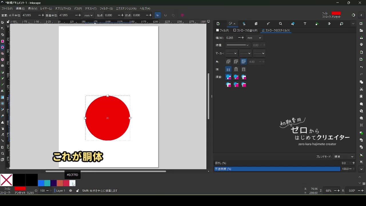 最初の円が胴体です。頭の方が重なり順が手前に来るので先に胴体を作ります。
