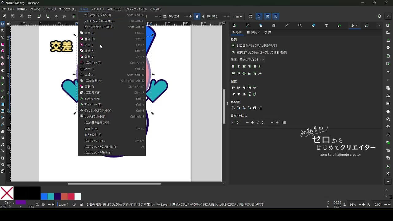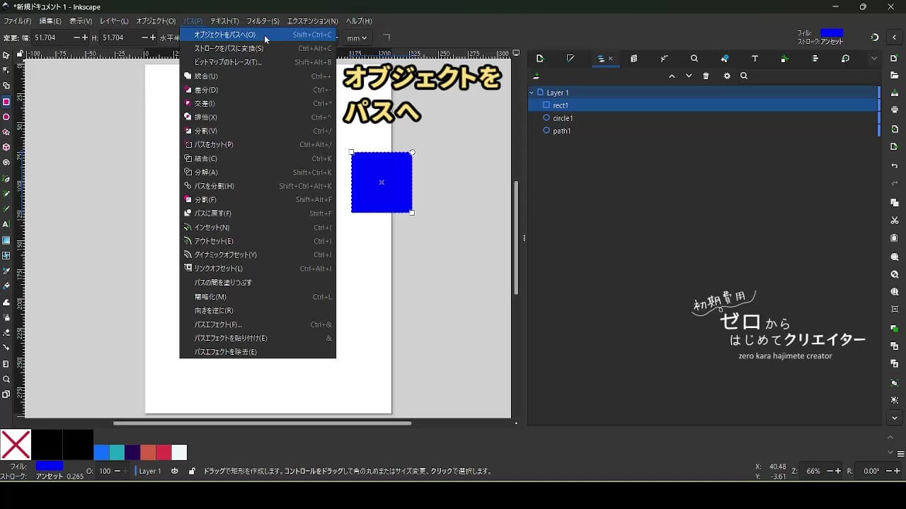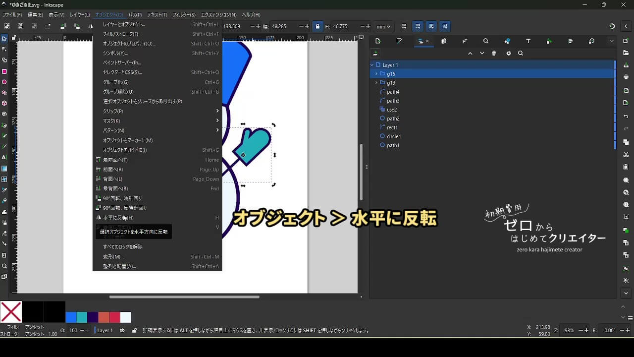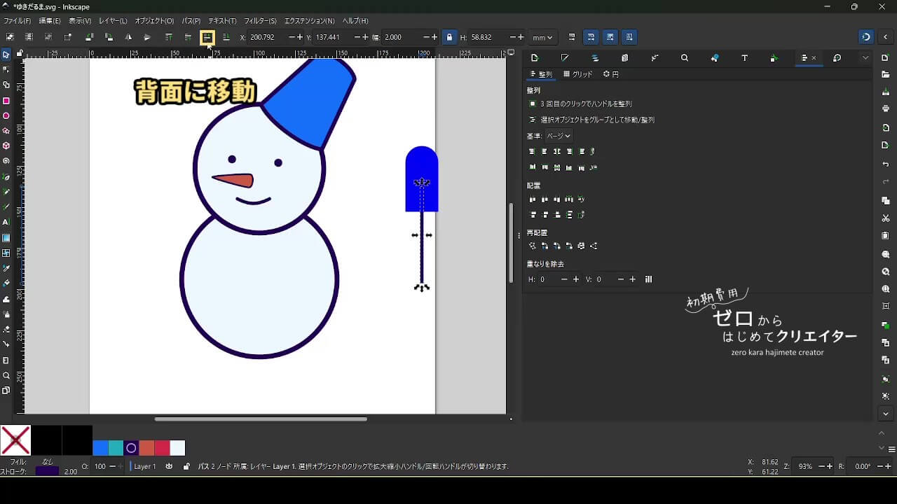 Inkscapeで作成した図形は基本的に上へ上へ(Z方向で手前側に)積み重なっていきます。重なり順を変更したい時は[レイヤーとオブジェクト]でドラッグするか、選択ツールの[最前面に移動]・[最背面に移動]などのコマンドを使用します。