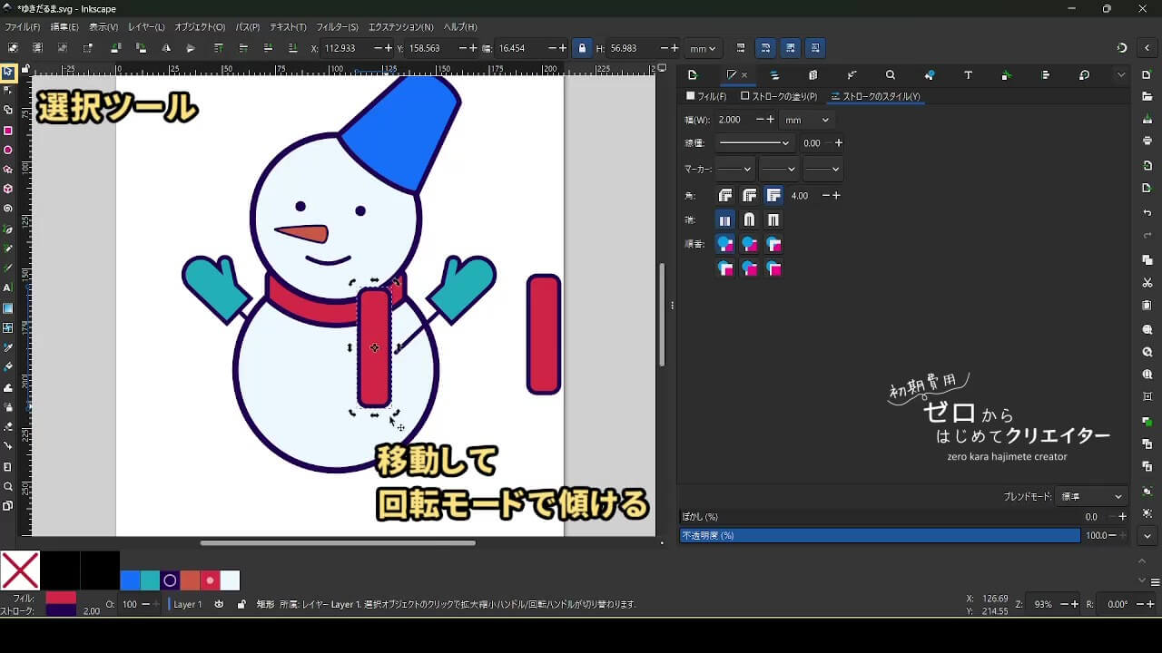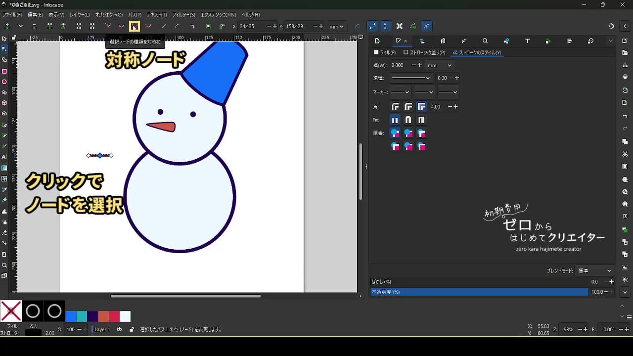 Inkscapeは正確に線を引く・形を作るという操作が得意分野で、他のお絵かきソフトとは少し違う性質を持っています。描いた形は後からいくらでも変形が可能です。