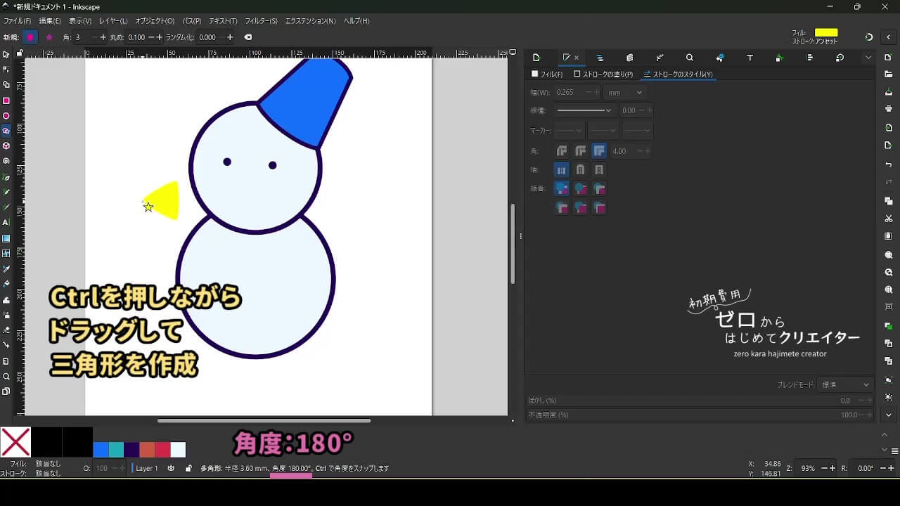- 多角形ツールでCtrlを押しながら[角度:180]で横向き三角形を作成します。