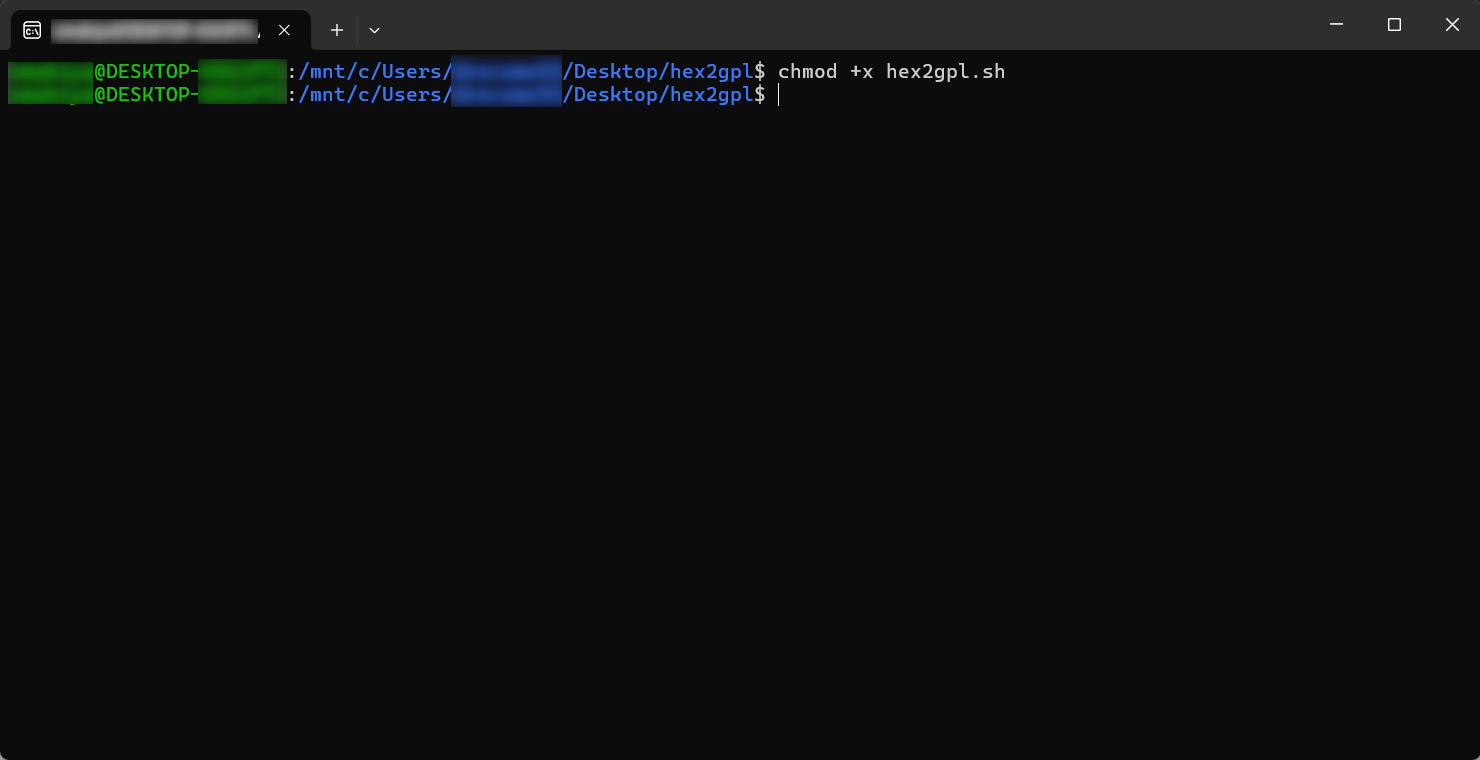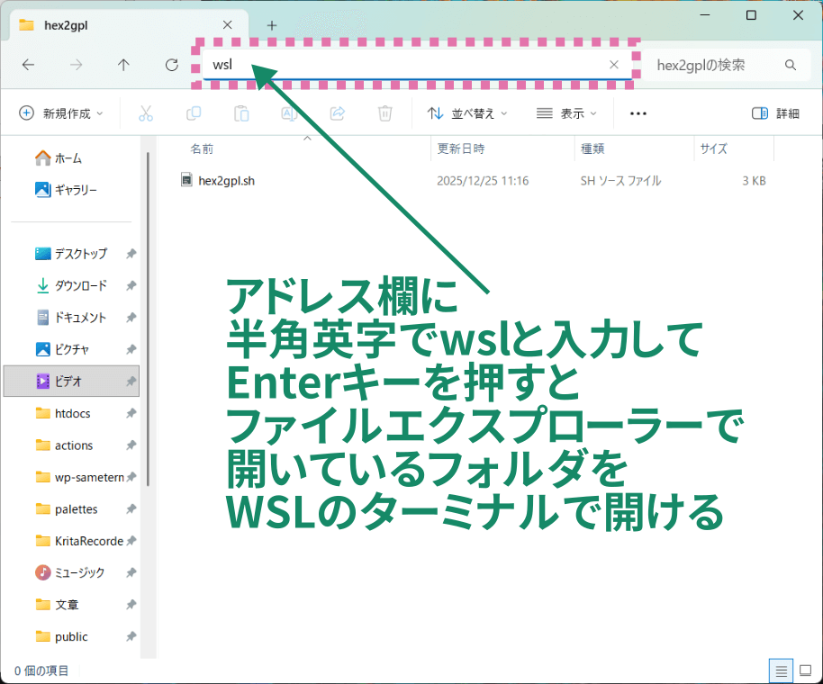 「hex2gpl.sh」を保存したディレクトリ(フォルダ)をファイルエクスプローラー上で開きます。