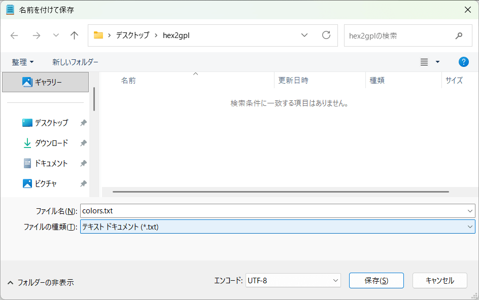 この16進数カラーコードと色名を書いたファイルをテキストドキュメント(.txt)として[ファイル>名前を付けて保存]します。