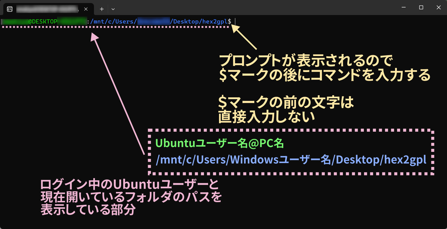 上記のコマンドは文字の上でクリックするとコピーできます。WSLターミナルの最新の行の$マークの横で右クリックするとコピーしたコマンドを貼り付けられます。入力できたらEnterを押すと実行できます。