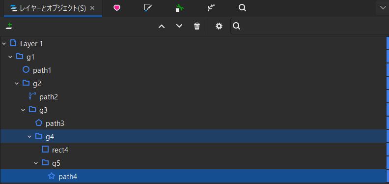 グループの中にさらにグループを作ることもでき、入れ子構造(ネスト)で管理することも可能です。入れ子になると、[レイヤーとオブジェクト]ダイアログでは項目が右に1文字分インデント(字下げ)され、どのオブジェクトがどのグループに属しているかが見てわかるようになります。グループの階層に制限はありませんが、階層が深くなりすぎると一覧が見づらくなり、目的のオブジェクトを探しにくくなるため、深くても5階層くらいまでで整理するのがおすすめです。