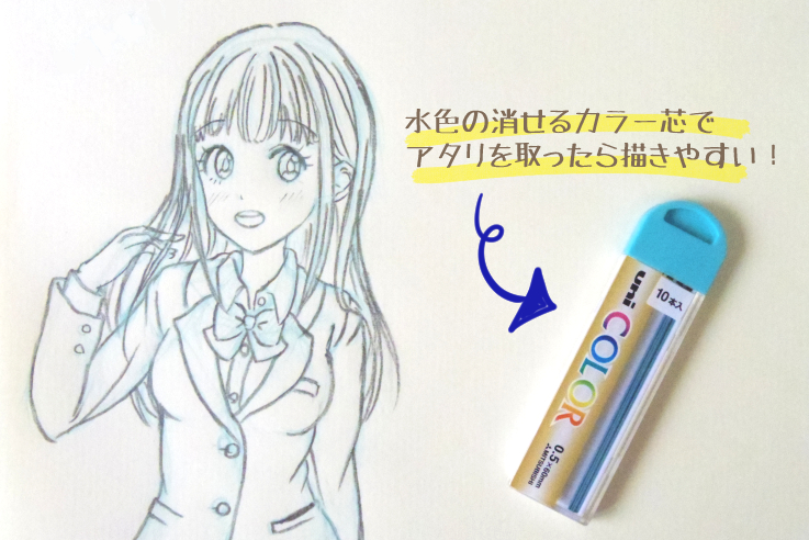 私は使ってないんですが、下絵を描いた紙に直接ペン入れをする場合は消しゴムで消せるタイプの水色のカラーシャープペンシルが便利だそうです。