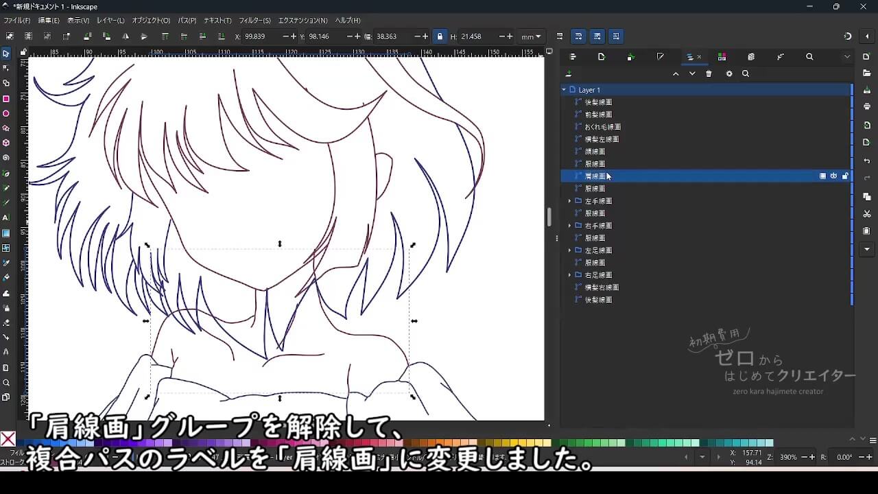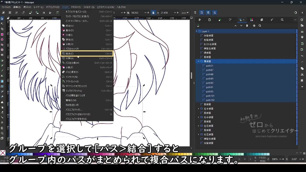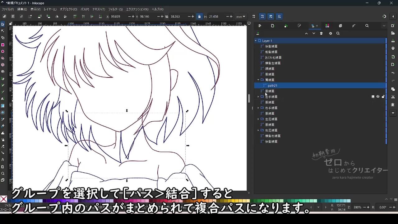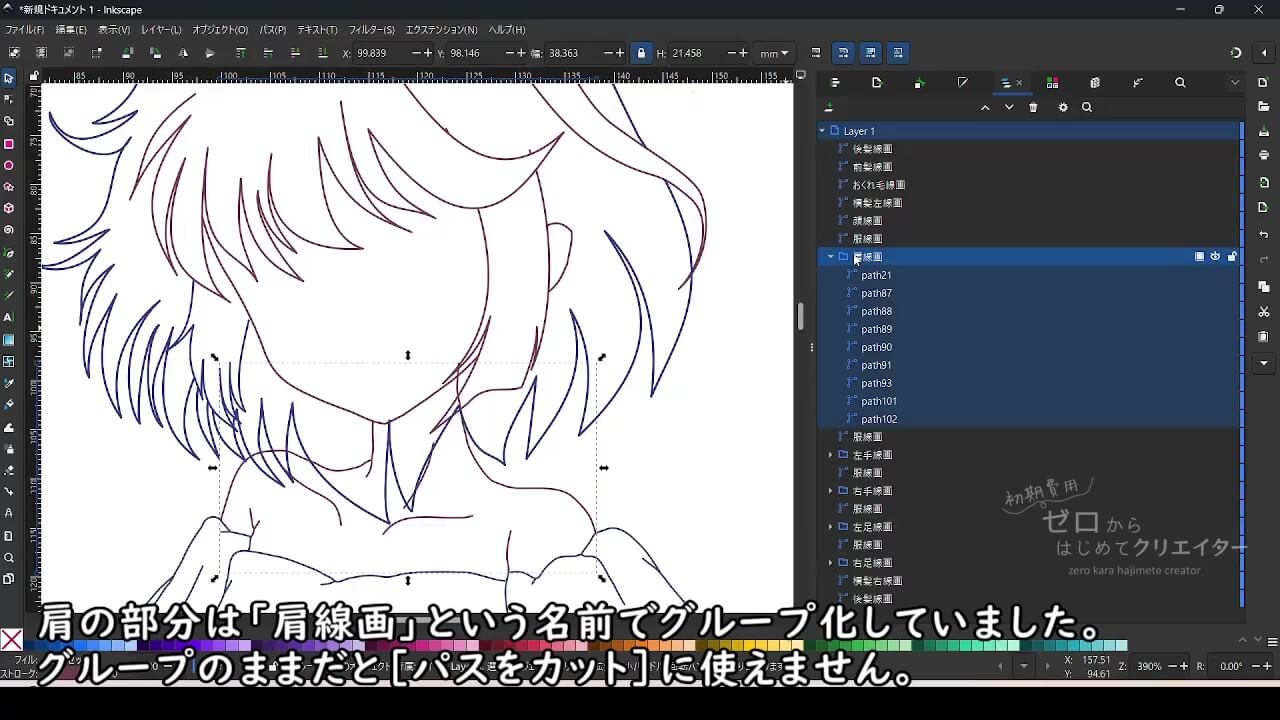 Inkscapeでイラストを着色する場合、パーツごとにパスを分けて作画しておくと塗り作業が楽になります。