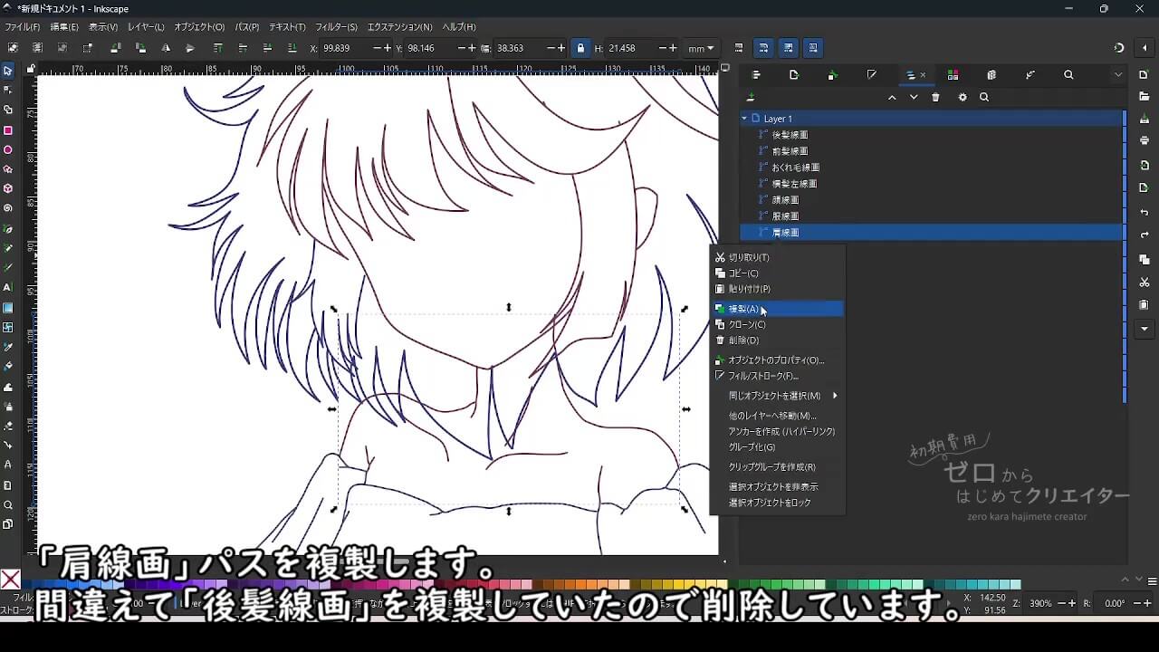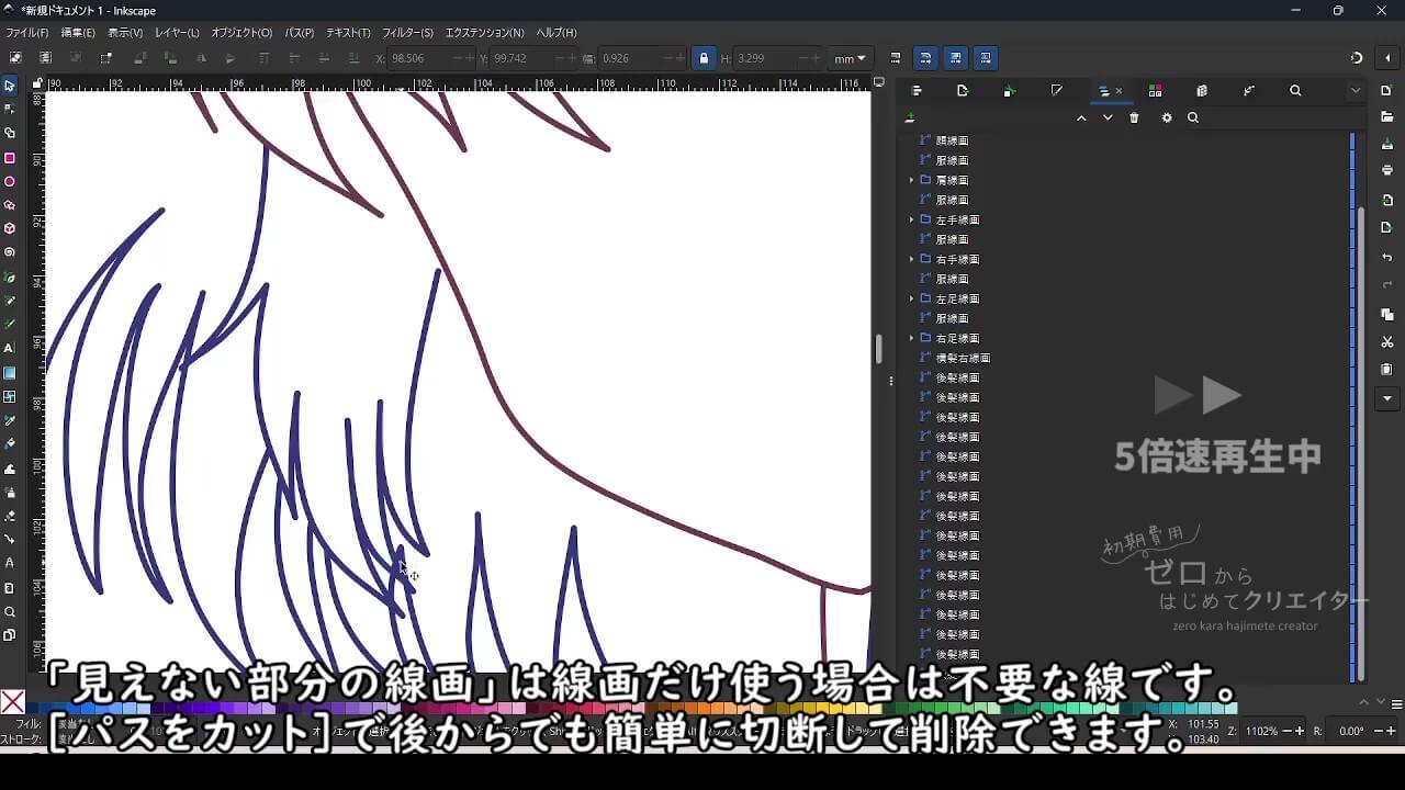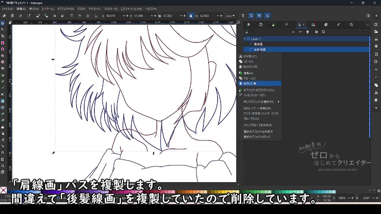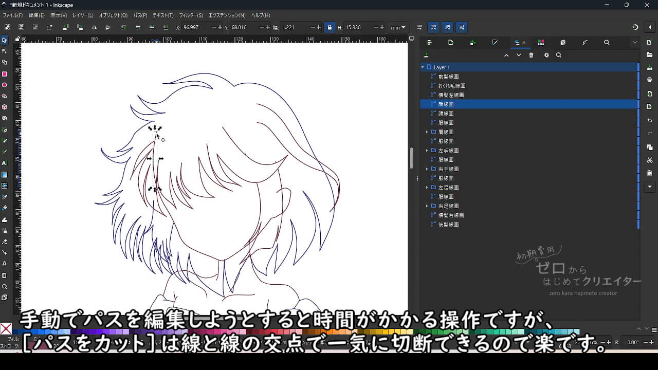 Inkscapeでイラストを作成する場合、塗りの範囲やパーツを微調整する際の手間を考えると、パーツ別にパスを作成し重なり順によって見えない部分も含めて作っておくと都合がいいからです。