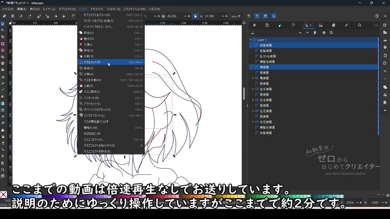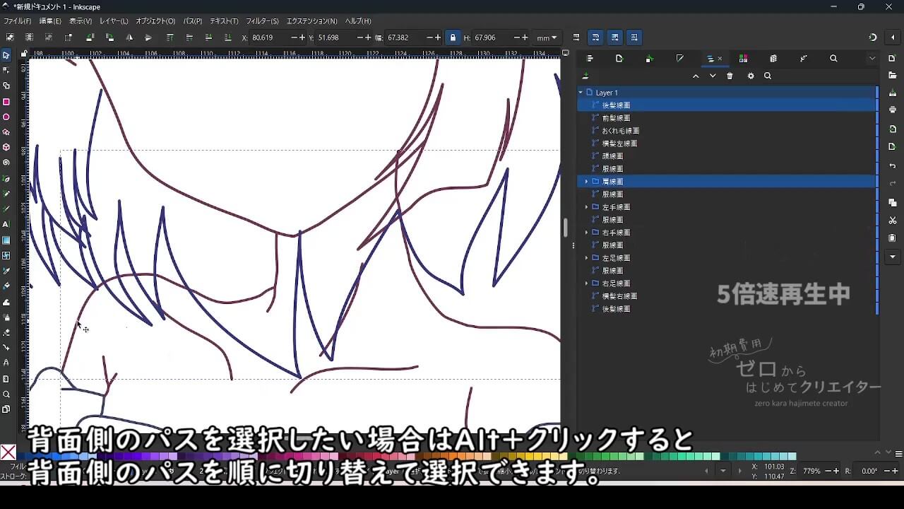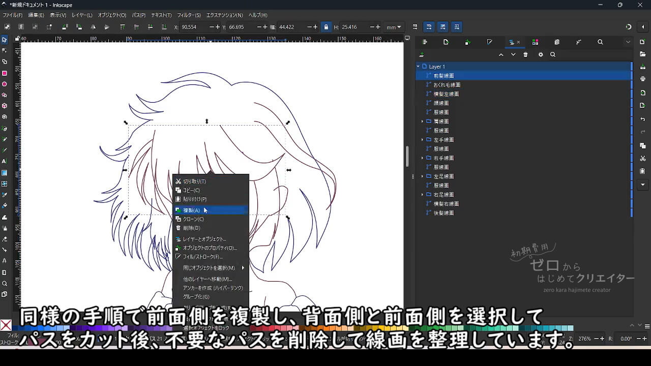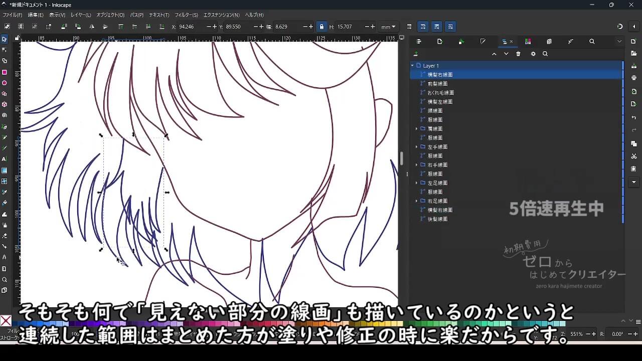 Inkscapeでイラストを作成する場合、塗りの範囲やパーツを微調整する際の手間を考えると、パーツ別にパスを作成し重なり順によって見えない部分も含めて作っておくと都合がいいからです。