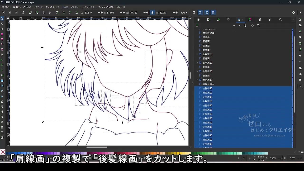 Inkscapeでイラストを作成する際は、オブジェクトの重なり順を意識しながら、できるだけシンプルな形状で表現できるようにパーツ分けをすると効率的に作画できます。