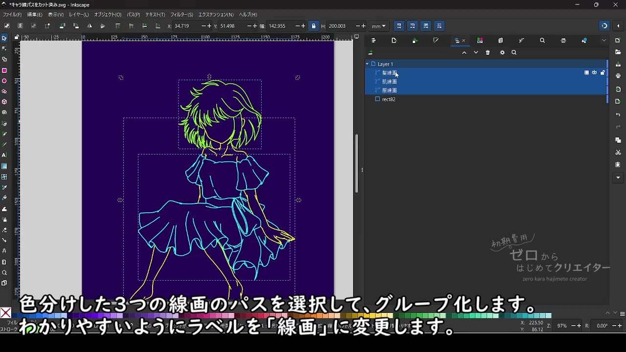 今回の例では、あらかじめ線画の部分には「線画」という単語を含めたラベルを付けて管理していたので、Inkscapeの[検索/置換]機能で「線画」という言葉でプロパティを対象に検索するだけで一気に選択できます。