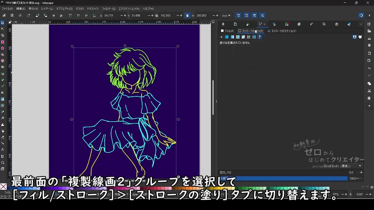 複製線画2を選択ツールで選択して[フィル/ストローク]ダイアログから[ストロークの塗り]の色を白に変更します。